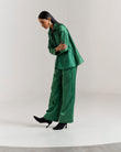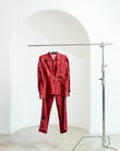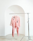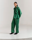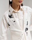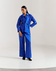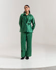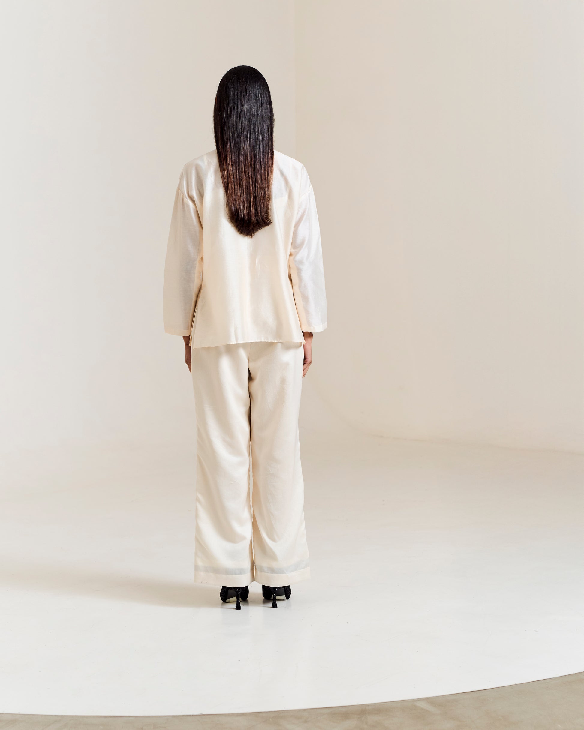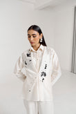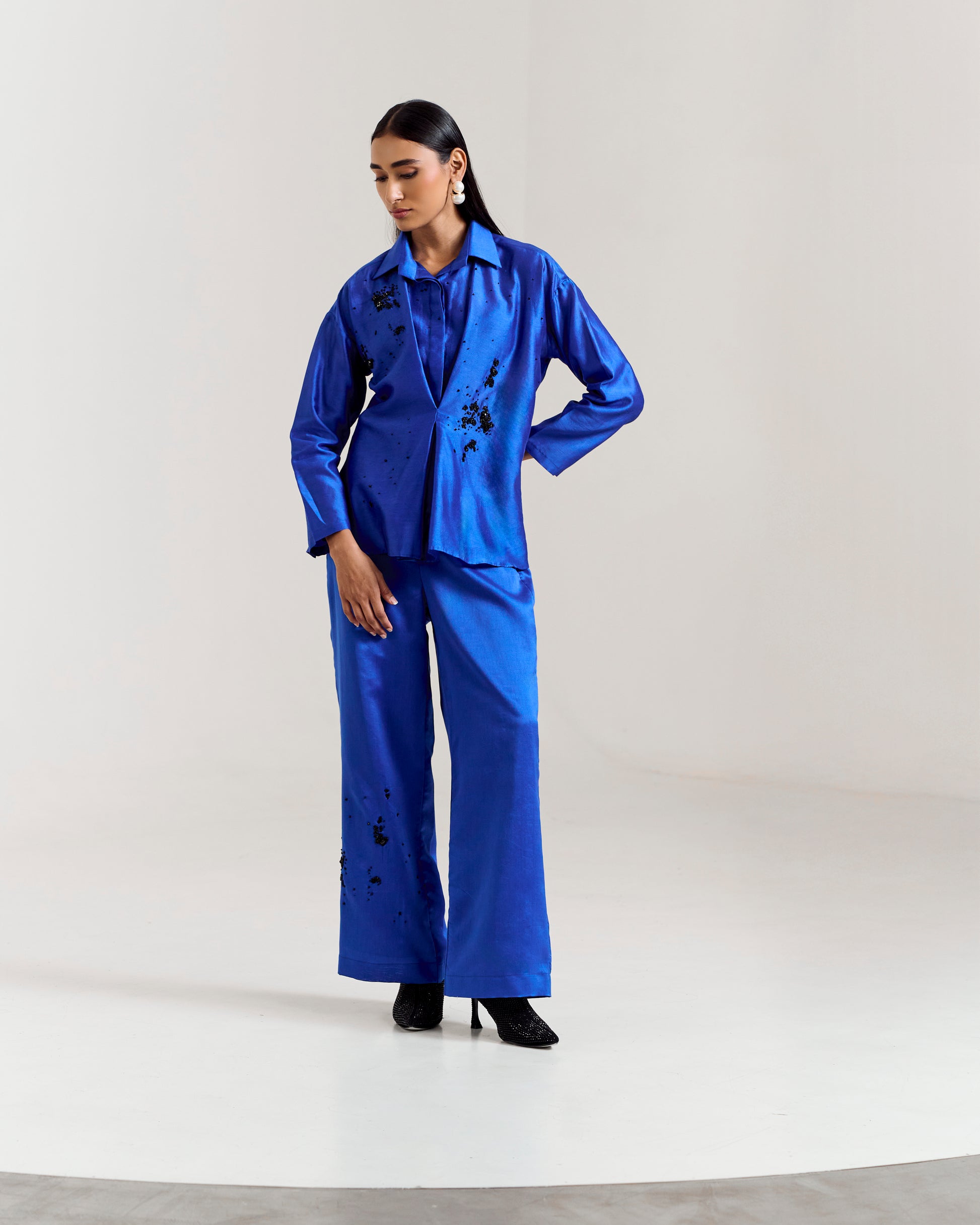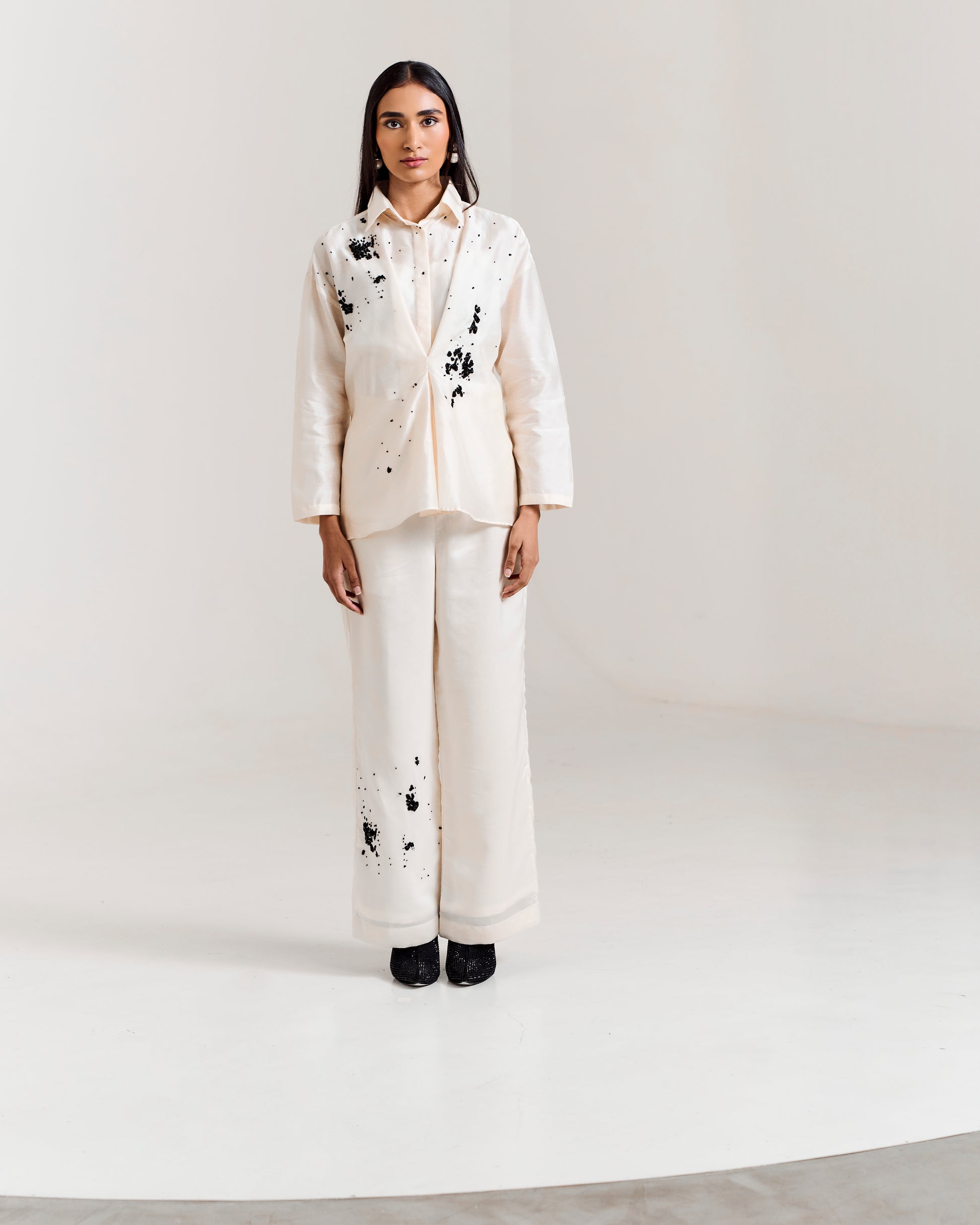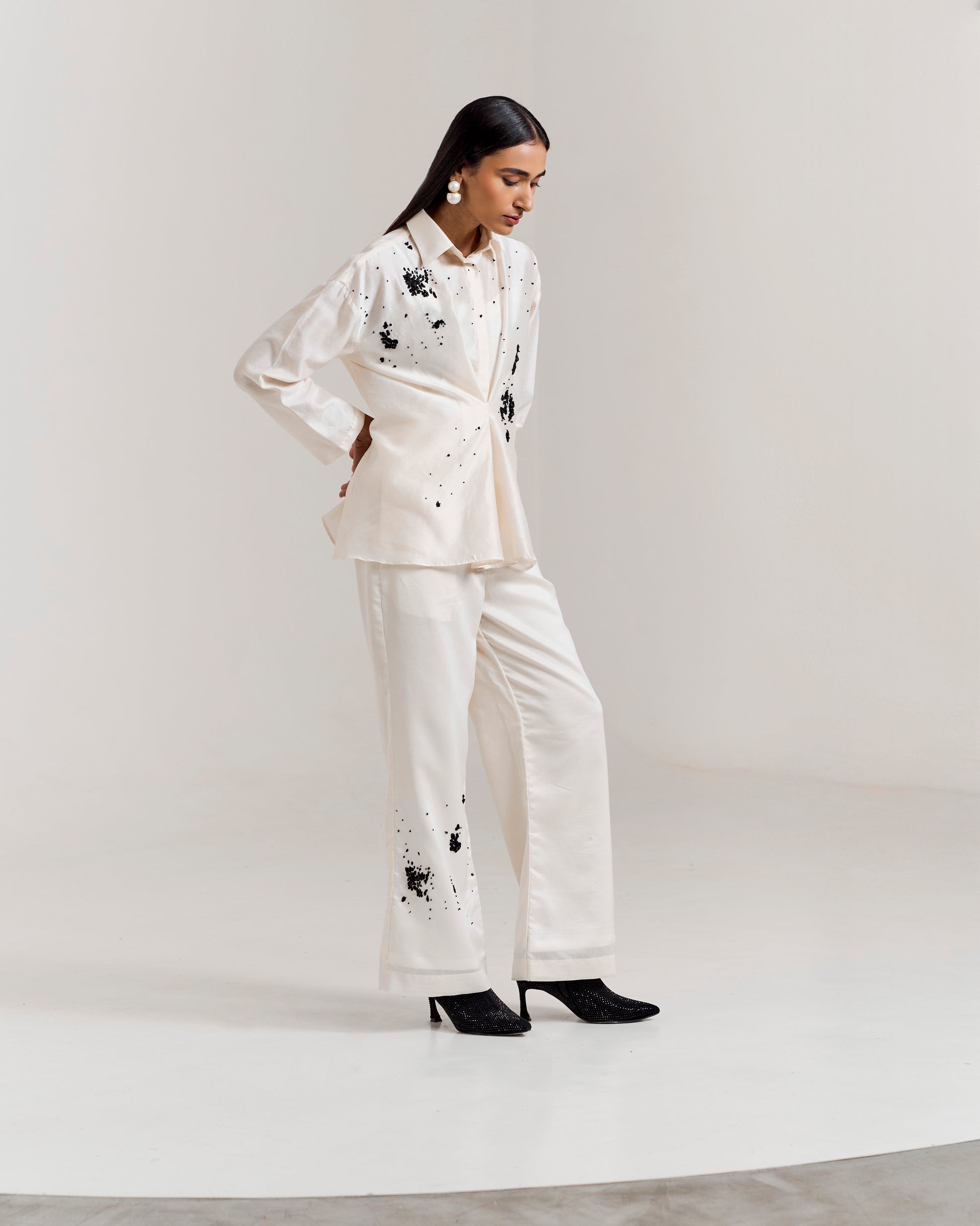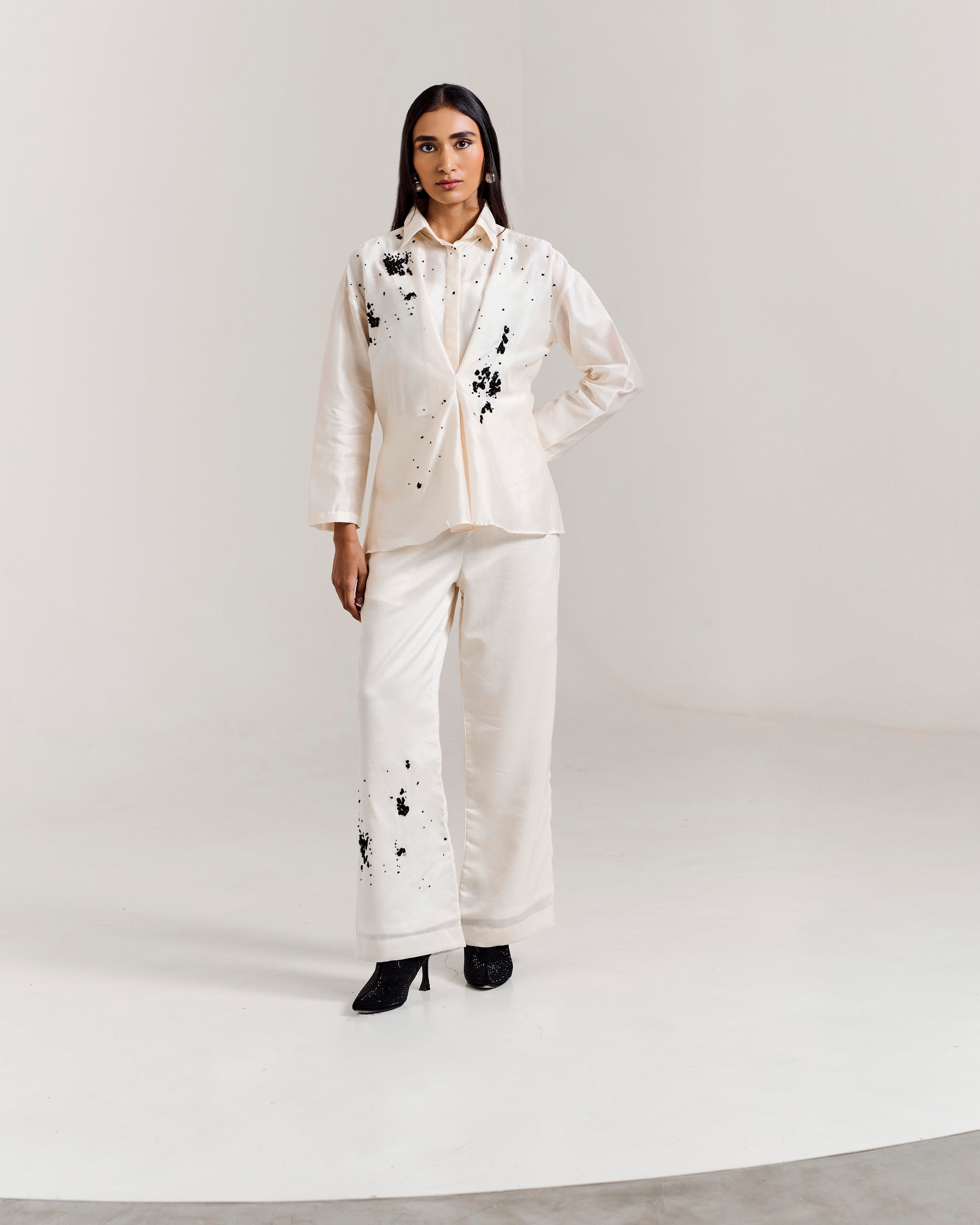 Crafted in Chanderi silk, this co-ord set features a shirt and pants adorned with scattered abstract hand motifs for a formal yet edgy look. A distinctive front stitch detail on the shirt adds a modern forward touch making it an ideal choice for those who like their classics with a twist.
